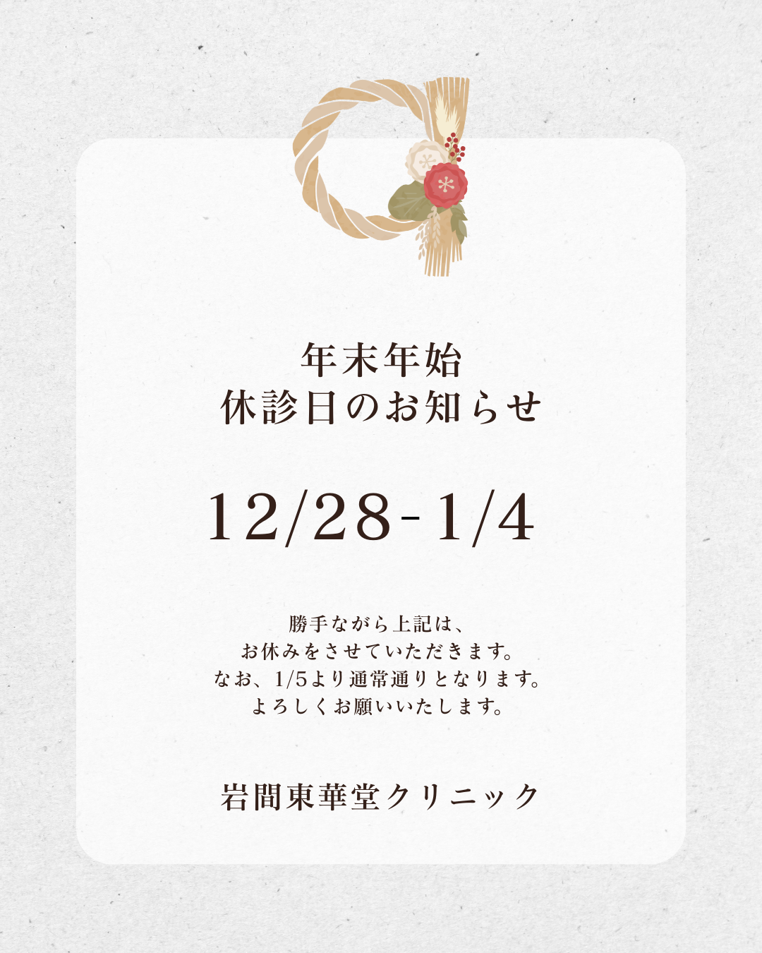 年末年始の休診日は12月28日(日)~1月4日(日)までとなります。
